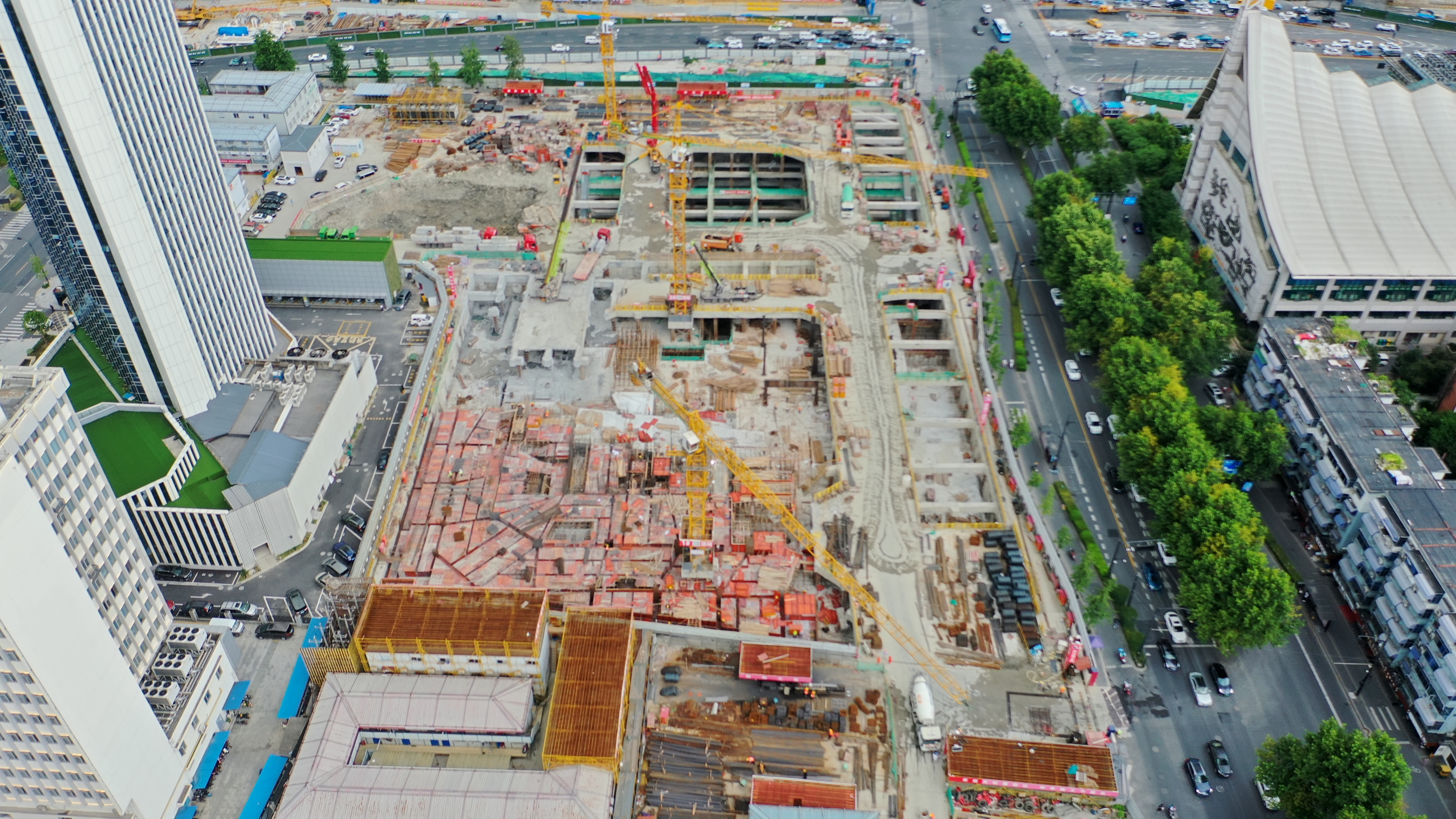 杭州中心項目地處繁華的武林商圈,是杭州政治、經(jīng)濟、文化中心,總建筑面積約25萬方,包含6層地下室,地塊距離地鐵1號線武林廣場站僅3米,挖深深度超過35m,是浙江省在建最深基坑,也是華潤置地在建項目中的最深基坑,施工難度非常之大。