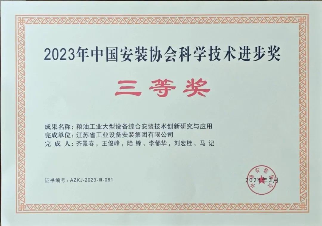 會(huì)上,孟堅(jiān)副會(huì)長(zhǎng)宣讀《關(guān)于表彰2023年中國(guó)安裝協(xié)會(huì)科學(xué)技術(shù)進(jìn)步獎(jiǎng)獲獎(jiǎng)單位的決定》,向2023年中國(guó)安裝協(xié)會(huì)科學(xué)技術(shù)進(jìn)步獎(jiǎng)獲獎(jiǎng)單位和成果完成人代表頒發(fā)了榮譽(yù)證書。其中包含我司獲得的兩項(xiàng)科技進(jìn)步獎(jiǎng):中國(guó)安裝協(xié)會(huì)科學(xué)技術(shù)進(jìn)步獎(jiǎng)二等獎(jiǎng)——“江蘇省高層民用建筑工程消防驗(yàn)收現(xiàn)場(chǎng)評(píng)定技術(shù)指南”,中國(guó)安裝協(xié)會(huì)科學(xué)技術(shù)進(jìn)步獎(jiǎng)三等獎(jiǎng)——“糧油工業(yè)大型設(shè)備綜合安裝技術(shù)創(chuàng)新研究與應(yīng)用”。