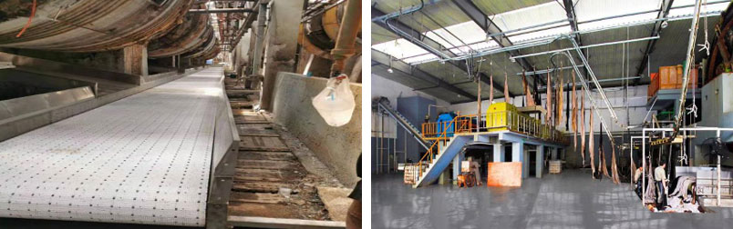 2. Automatic line (come out of the drum) used for soaked skin (pickled) The soaked leather is discharged from the drum and automatically falls to the drum line. The drum line will transport the leather to the designated place, and then it is conveyed to the high table of the meat removing machine with the skin hanging line. The leather will automatically fall to the meat removing machine for removing meat.