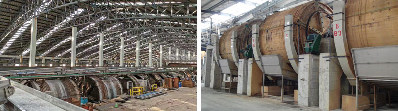 6. Tanning line into the drum After finishing the cutting, upper leather is pulled out from the cutting machine by the automatic pulling device and falls to the tanning line into the drum,the conveyor line automatically measures the weight of the leather and sends it to the designated drum for tanning. After reaching the specified weight, the drum door closes and the conveyor belt transports the leather to other drum according to the set program.