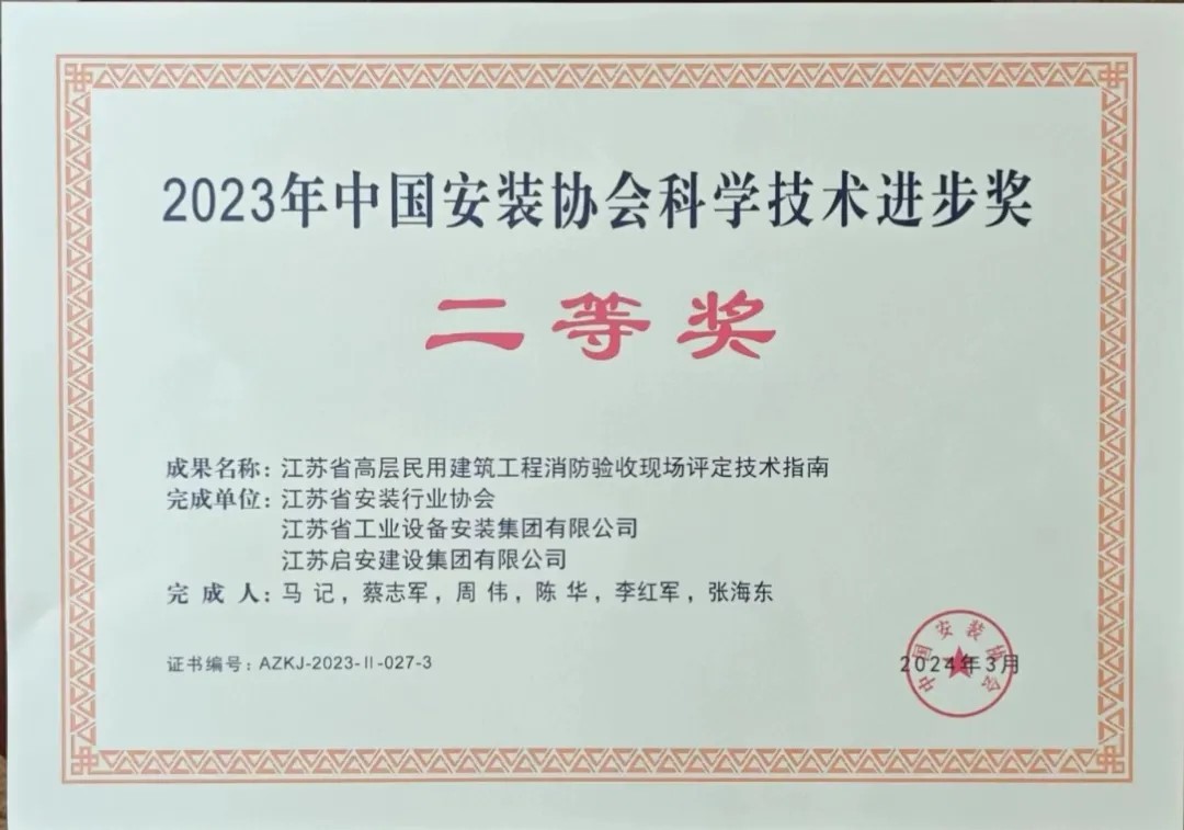 會(huì)上,孟堅(jiān)副會(huì)長(zhǎng)宣讀《關(guān)于表彰2023年中國(guó)安裝協(xié)會(huì)科學(xué)技術(shù)進(jìn)步獎(jiǎng)獲獎(jiǎng)單位的決定》,向2023年中國(guó)安裝協(xié)會(huì)科學(xué)技術(shù)進(jìn)步獎(jiǎng)獲獎(jiǎng)單位和成果完成人代表頒發(fā)了榮譽(yù)證書。其中包含我司獲得的兩項(xiàng)科技進(jìn)步獎(jiǎng):中國(guó)安裝協(xié)會(huì)科學(xué)技術(shù)進(jìn)步獎(jiǎng)二等獎(jiǎng)——“江蘇省高層民用建筑工程消防驗(yàn)收現(xiàn)場(chǎng)評(píng)定技術(shù)指南”,中國(guó)安裝協(xié)會(huì)科學(xué)技術(shù)進(jìn)步獎(jiǎng)三等獎(jiǎng)——“糧油工業(yè)大型設(shè)備綜合安裝技術(shù)創(chuàng)新研究與應(yīng)用”。