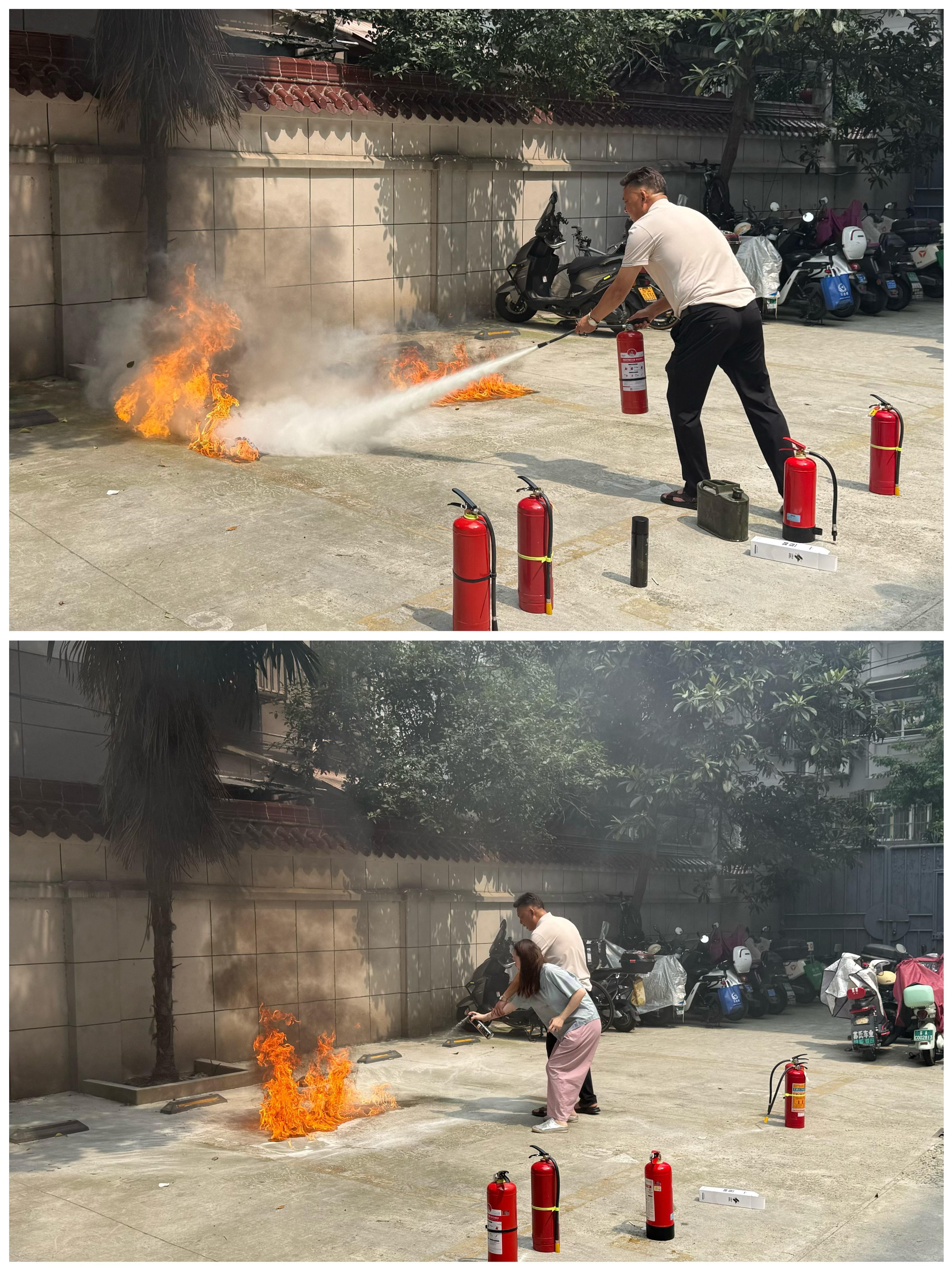 2. 滅火器材實操在專業(yè)指導下,員工們分組進行滅火器實操訓練。從防煙面罩佩戴到滅火器使用,每個環(huán)節(jié)都嚴格規(guī)范,確保人人過關(guān)。